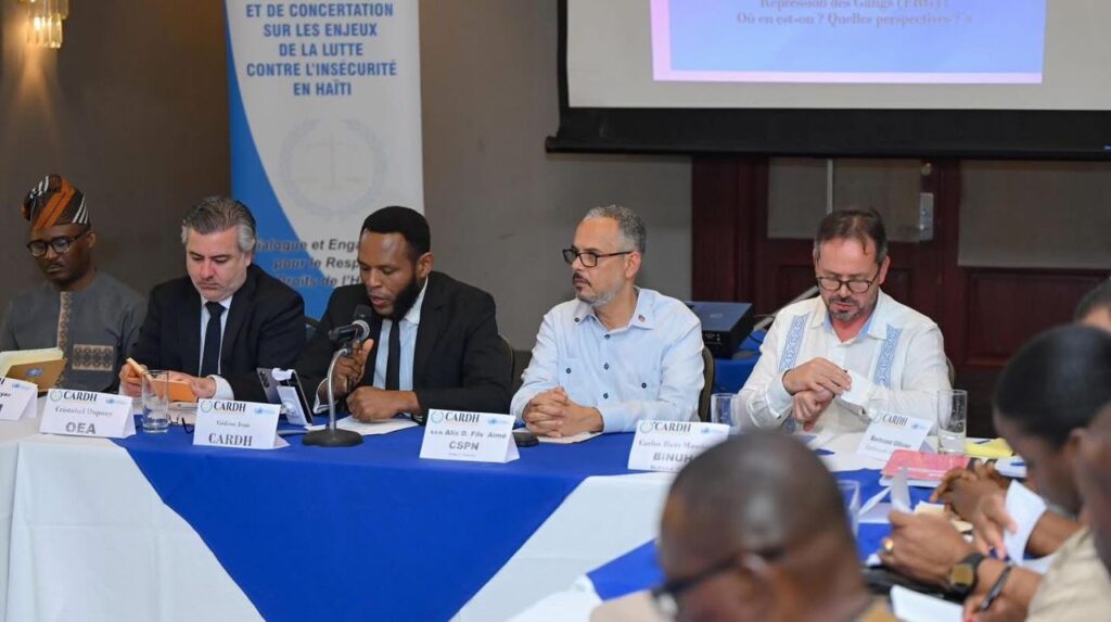 Le jeudi 27 novembre 2025, le Premier ministre Alix Didier Fils-Aimé a participé à la conférence de la Table Sectorielle sur la Sécurité (TSS), organisée par le CARDH à l’Hôtel Karibe. Cette rencontre, centrée sur la transformation de la MMAS en Force de Répression des Gangs (FRG), a rassemblé des représentants de l’OEA, de l’ONU, des autorités judiciaires, de la PNH, des FAd’H et de la société civile.