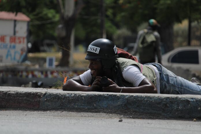 Un photojournaliste allongé au sol pour se protéger des tirs provenant de différentes directions, au Champ-de-Mars le 20 juillet 2024 / Dieugo André