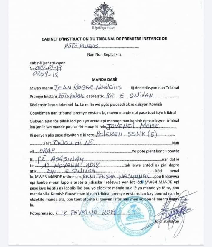 L’ancien juge Noëlcius a reconnu avoir signé le document et y apposé un sceau officiel et l’avoir antidaté au 18 février 2019, accusant « Nèg Bannan n nan » d’assassinat ».
