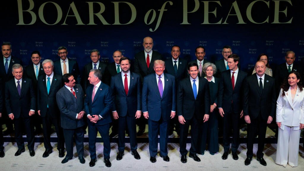 Crédit photo : le président américain Donald Trump pose pour une photo de famille avec les dirigeants internationaux membres de son Conseil de la paux, lors de la réunion inaugurale, à l’Institut de la paix, le 19 février 2026 à Washington, DC. © Chip Somodevilla, AFP
