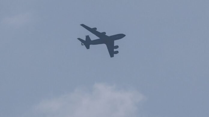 Un avion ravitailleur Boeing KC-135 de l’US Air Force photographié le 4 mars 2026. (JACK GUEZ / AFP)